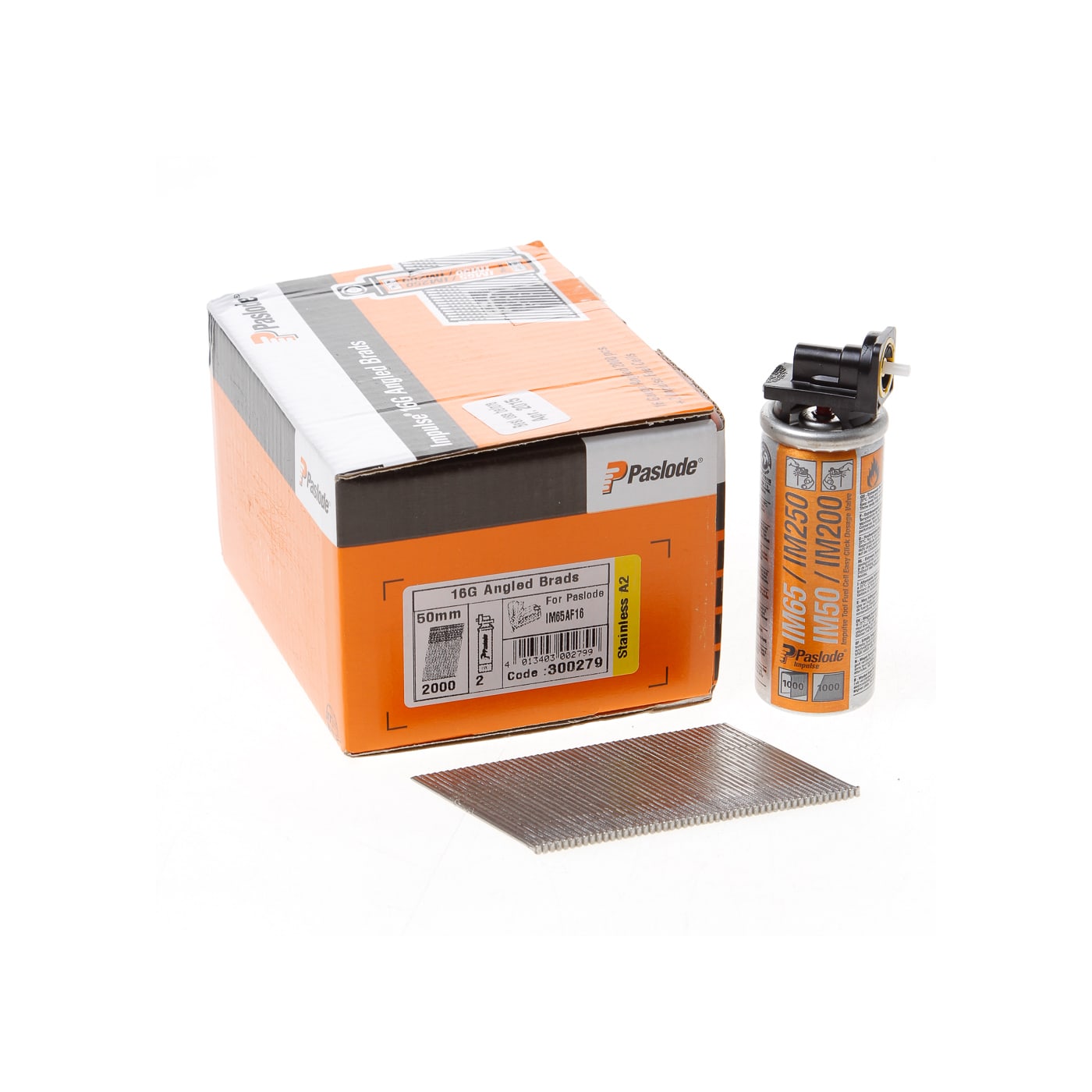 Paslode afwerknagel roestvaststaal schuin F16 x 50mm inclusief gas IM65 doos met 2000 nagels