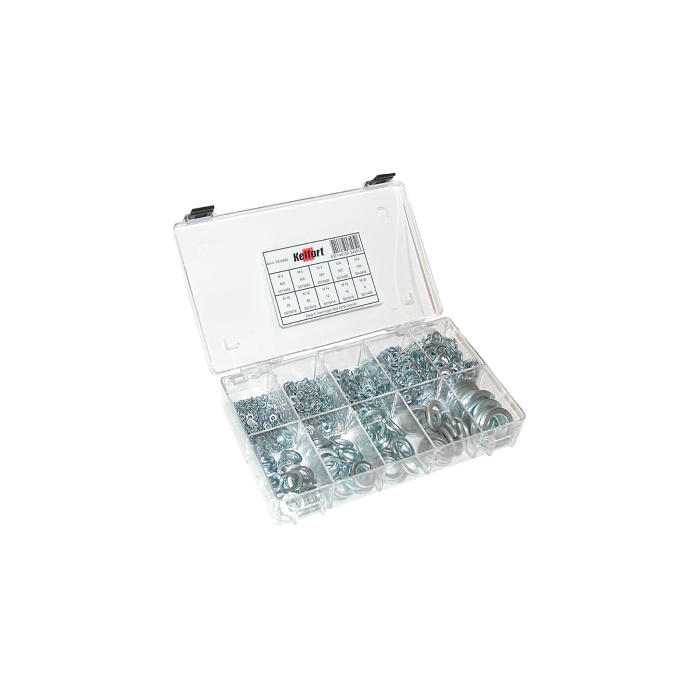 Transparante kunststof doos, 10 vaks. Afmeting 218x142x42 mm. Inhoud:VeerringenElektrolytisch verzinkt. Van plat materiaal, zonder opgebogen einden. Volgens DIN 127B.boutmaat stuksM3 400M4 400M5 200M6 200M8 100M10 25M12 20M14 12M16 12M20 8