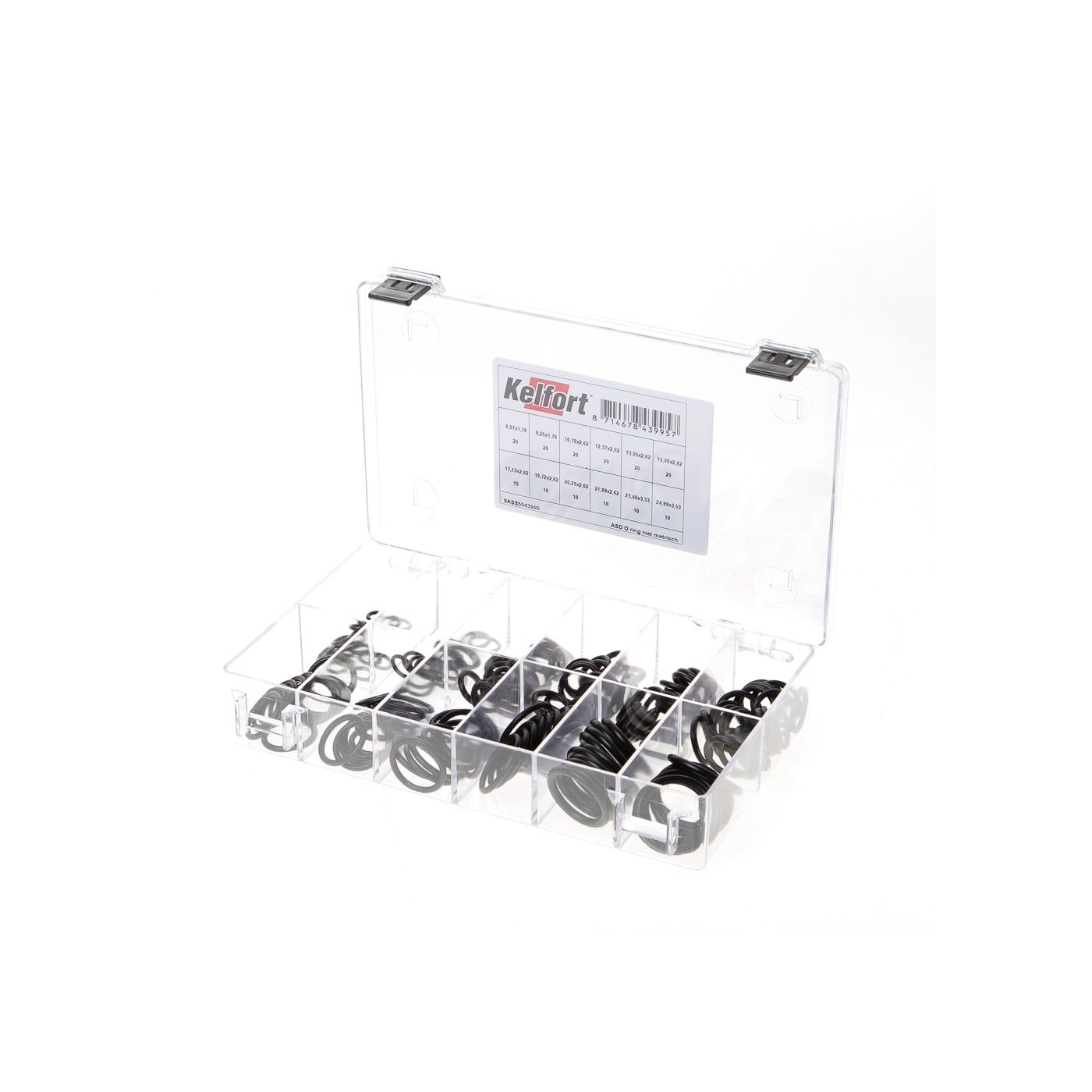 Transparante kunststof doos, 12 vaks. Afmeting 218x142x42 mm. Inhoud: O-ringen Rubber, NBR. Niet metrisch. diam. inwendig mm dikte stuks 6,07 1,78 20 9,25 1,78 2010,78 2,62 2012,37 2,62 2013,95 2,62 2015,08 2,62 2017,13 2,62 1018,72 2,62 1020,29 2,62 1021,89 2,62 1023,40 3,53 1024,99 3,53 10