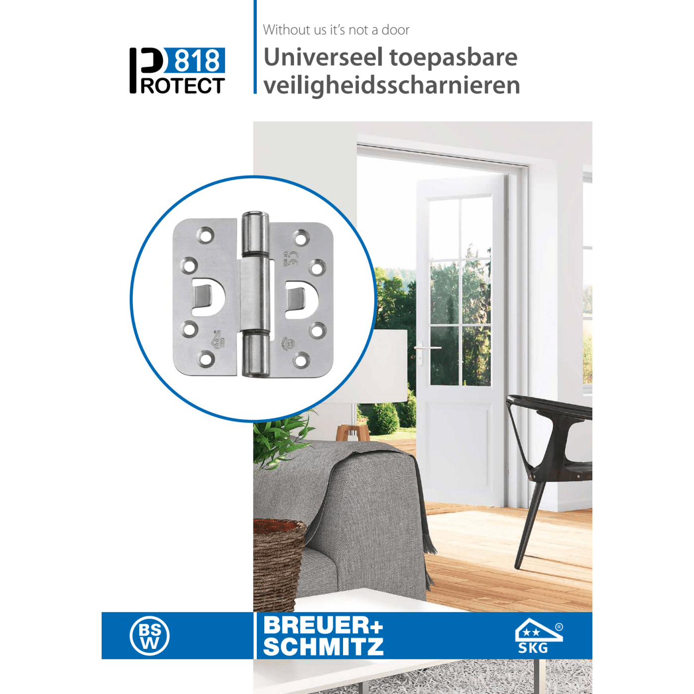 Met de universeel toepasbare 818 Protect veiligheidsscharnieren van BSW heb je alleen nog een inkrozing nodig. Een gat boren voor de dievenpen is niet meer nodig.Innovatieve Protect veiligheidshaken met hangnaadbegrenzing.• Geen gat meer boren voor de dievenpen• Verbeterde onderhoudsvrije glijlagers• Hoger draagvermogen tot 150 kilo• Geen inwatering aan de buitenzijde• Leverbaar programma in verzinkt, zwart, roestvaststaal en Accoya-proof in meerdere afmetingen• C2C bronze gecertificeerd• Duits kwaliteitsproduct• SKG **• Schroefadvies : 4,5x40mmBelastingwaarden:89x80 mm 150 kg89x89 mm 150 kg89x102 mm 120 kg89x127 mm 80 kg89x152 mm 80 kgVirtueel deurgewicht:Deurdranger + 37%Openingsrem + 50%Sluitvertraging + 50%Vloerstopper + 50%Bredere deuren (>93cm) + 1,5% extra/cm