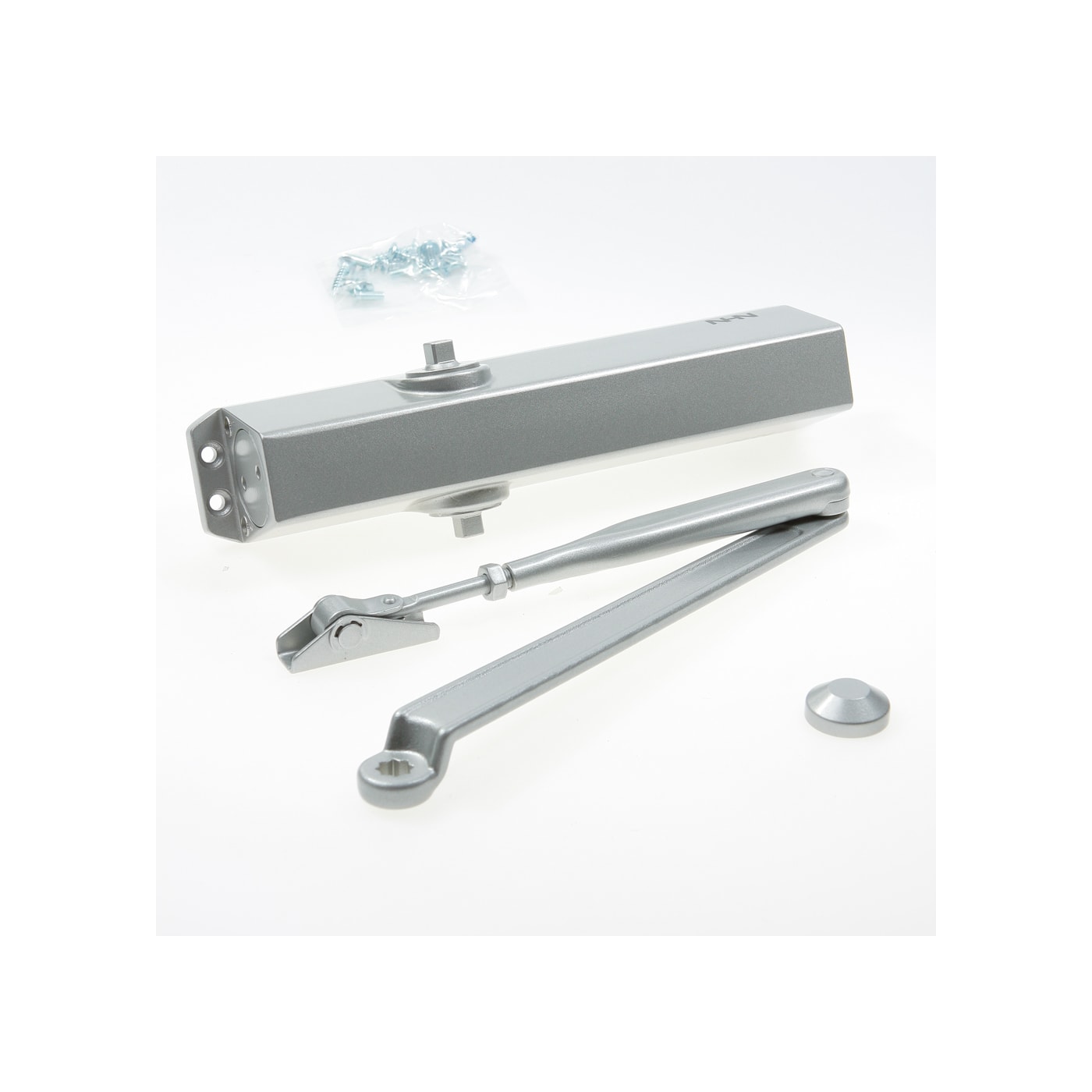 Zilverkleurig. In kracht instelbaar via een schroef aan de zijkant. Eenvoudige montage, goede afstelmogelijkheden inclusief de apart in te stellen eindslag via de arm. ###Optioneel zijn de functies van openingsdemping en/of sluitvertraging leverbaar.Ook met een instelbare vastzetarm, een glijarm met instelbare en verwijderbare vaststelling en diverse accessoires leverbaar.