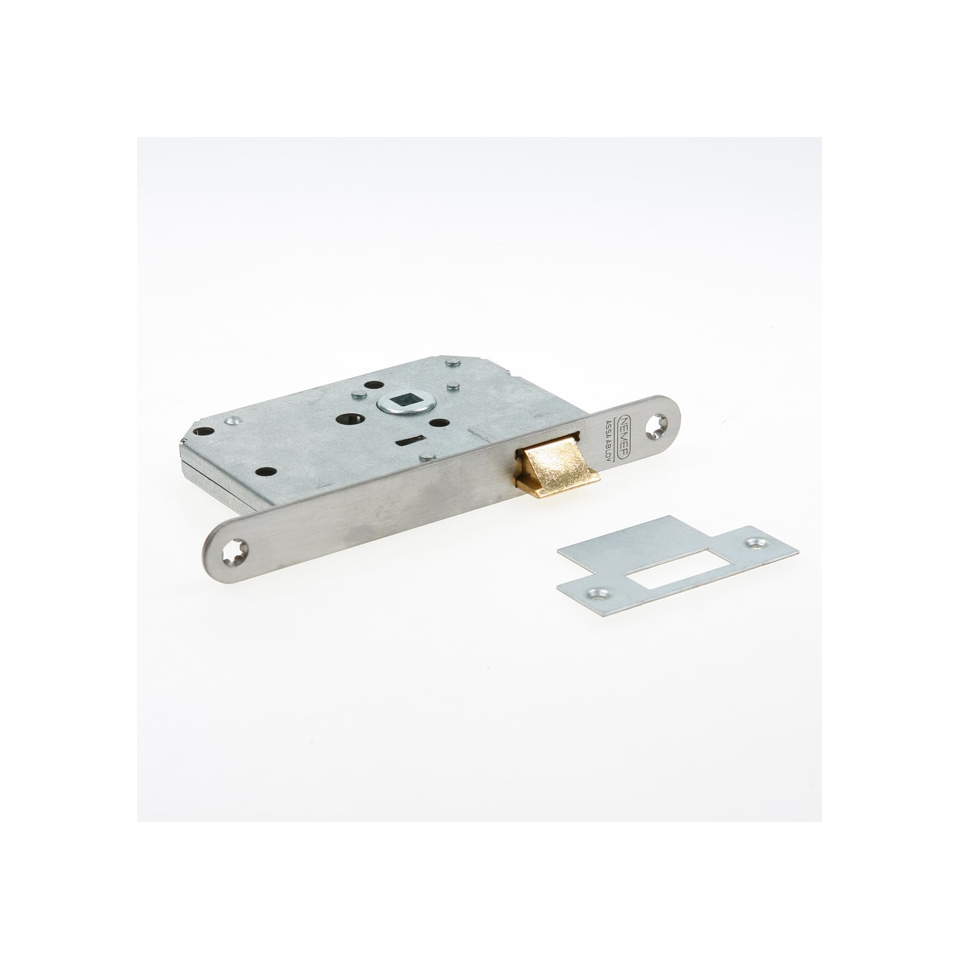 Standaard serie loopslot, geschikt voor binnendeuren in woningbouw. Insteekslot, dagschoot omlegbaar (links en rechts bruikbaar), messing schoten, krukgat 8 mm, dichte verzinkte kast van 117x80x17 mm met patentgaten voor rozetten, doornmaat 50 mm.