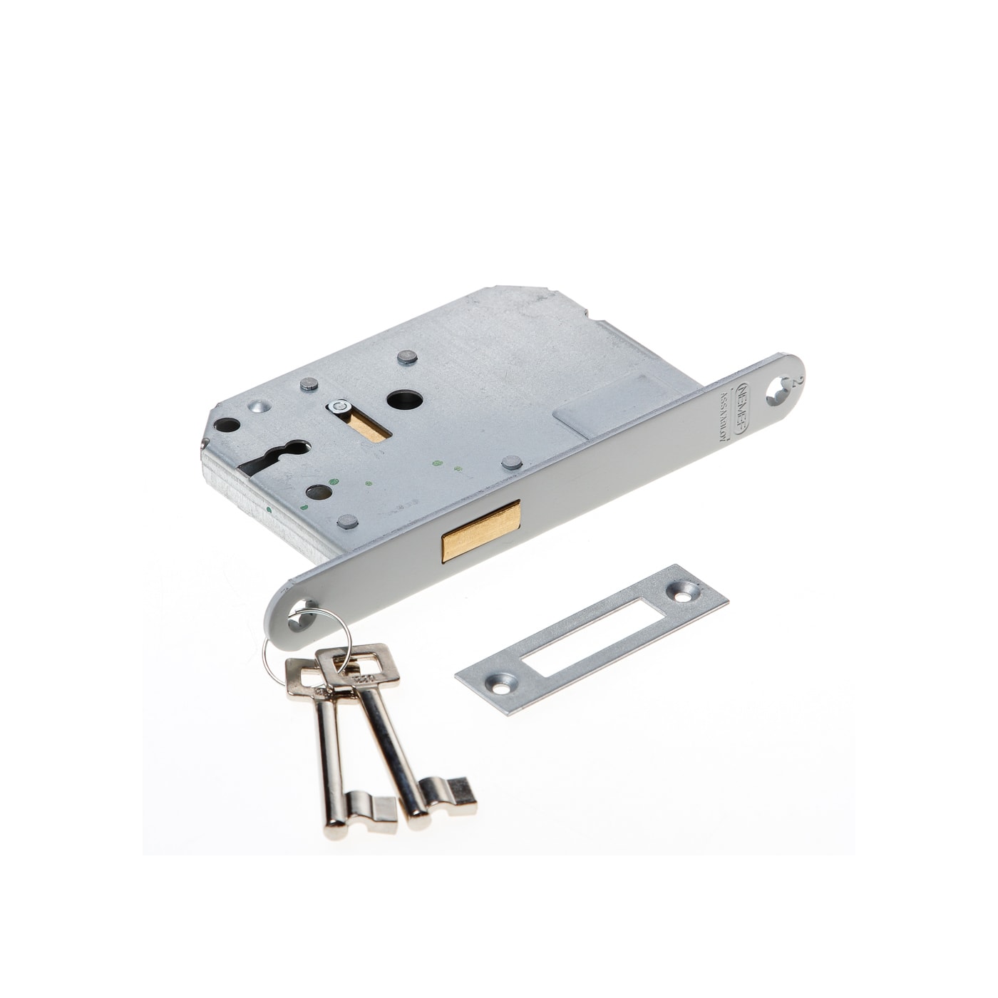 Standaard serie kastslot, geschikt voor binnendeuren in woningbouw. Insteekslot, één toers, messing nachtschoot, links en rechts bruikbaar, verzinkte kast van 117x80x17 mm, doornmaat 50 mm, met 2 sleutels S 1200 en 5 sluitingen (nr. 1210-1250).