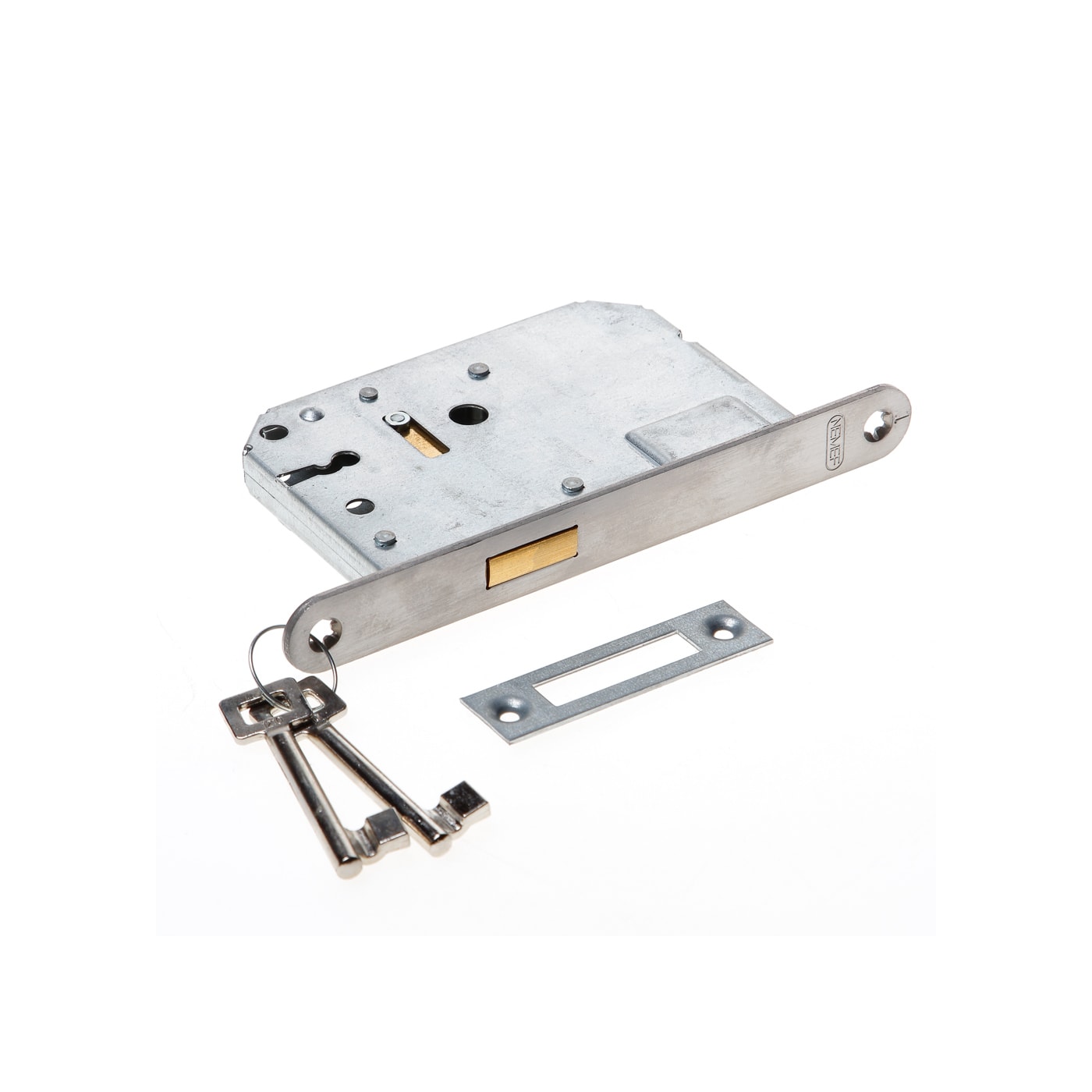 Standaard serie kastslot, geschikt voor binnendeuren in woningbouw. Insteekslot, één toers, messing nachtschoot, links en rechts bruikbaar, verzinkte kast van 117x80x17 mm, doornmaat 50 mm, met 2 sleutels S 1200 en 5 sluitingen (nr. 1210-1250).