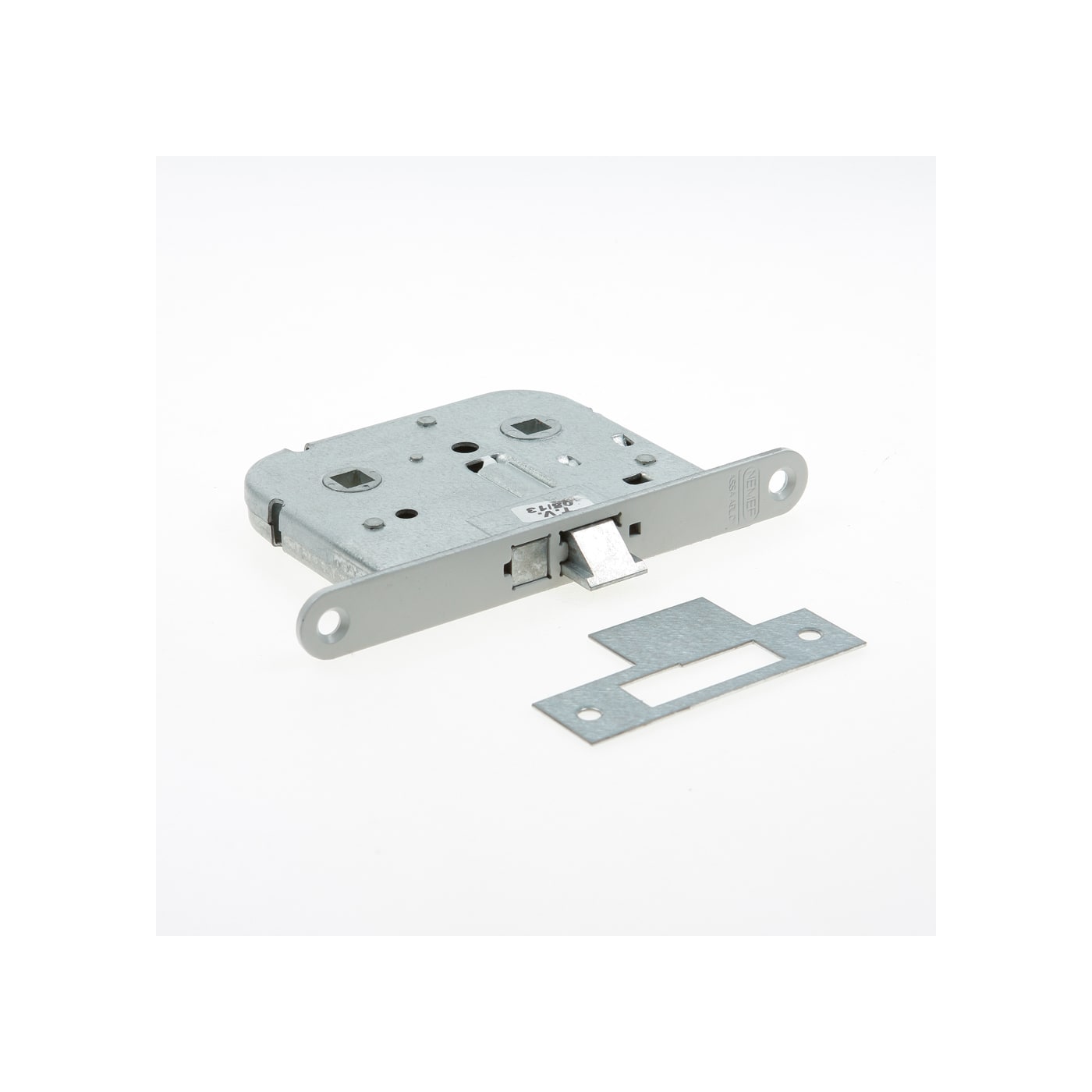 Klein insteek WC-badkamerslot, geschikt voor binnendeuren in de woningbouw. Eén toers zamac nachtschoot, 13 mm uitslag, zamac dagschoot omlegbaar (links en rechts bruikbaar), krukgat 8 mm, kruk-/krukgat h.o.h. 55 mm, smalle afgeronde gelakte stalen voorplaat van 153x18x2,75 mm, met dichte verzinkte kast van 100x83x16 mm, doornmaat 55 mm, zamac tuimelaar.
