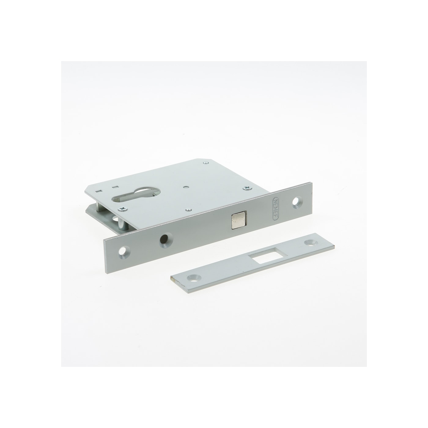 Middelzwaar schuifdeurslot. Insteekslot, staal geslepen harpoenschoot, links en rechts bruikbaar, staal gelakte voorplaat 150x22x3 mm, gelakte kast van 96x85x16 mm, doornmaat 55 mm, voor europrofielcilinder.