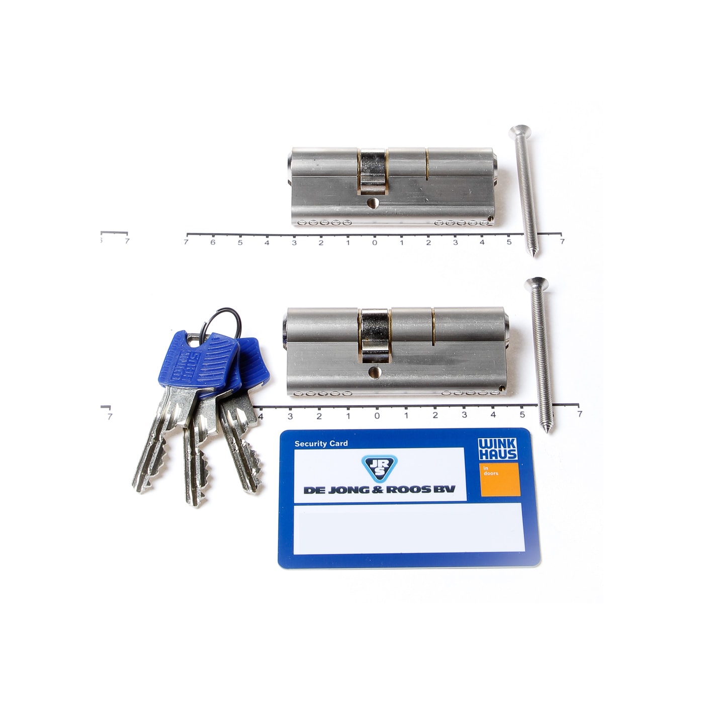 Dubbele cilinder van hoge kwaliteit, geschikt voor het maken van gelijksluitende sets. Voldoet aan SKG*** (3-sterren)Technische kopieerbeveiliging op de sleutel. Patent rechtelijk beschermd. Voorzien van certificaat en 3 sleutels per set. Op aanvraag kunnen op deze gelijksluitende sets worden uitgebreidt met enkele cilinders en knopcilinders, ook in diverse lengtes. Standaard voorzien van 3 sleutels per set, indien meer sleutels gewenst zijn kan dit worden bijbesteld.
