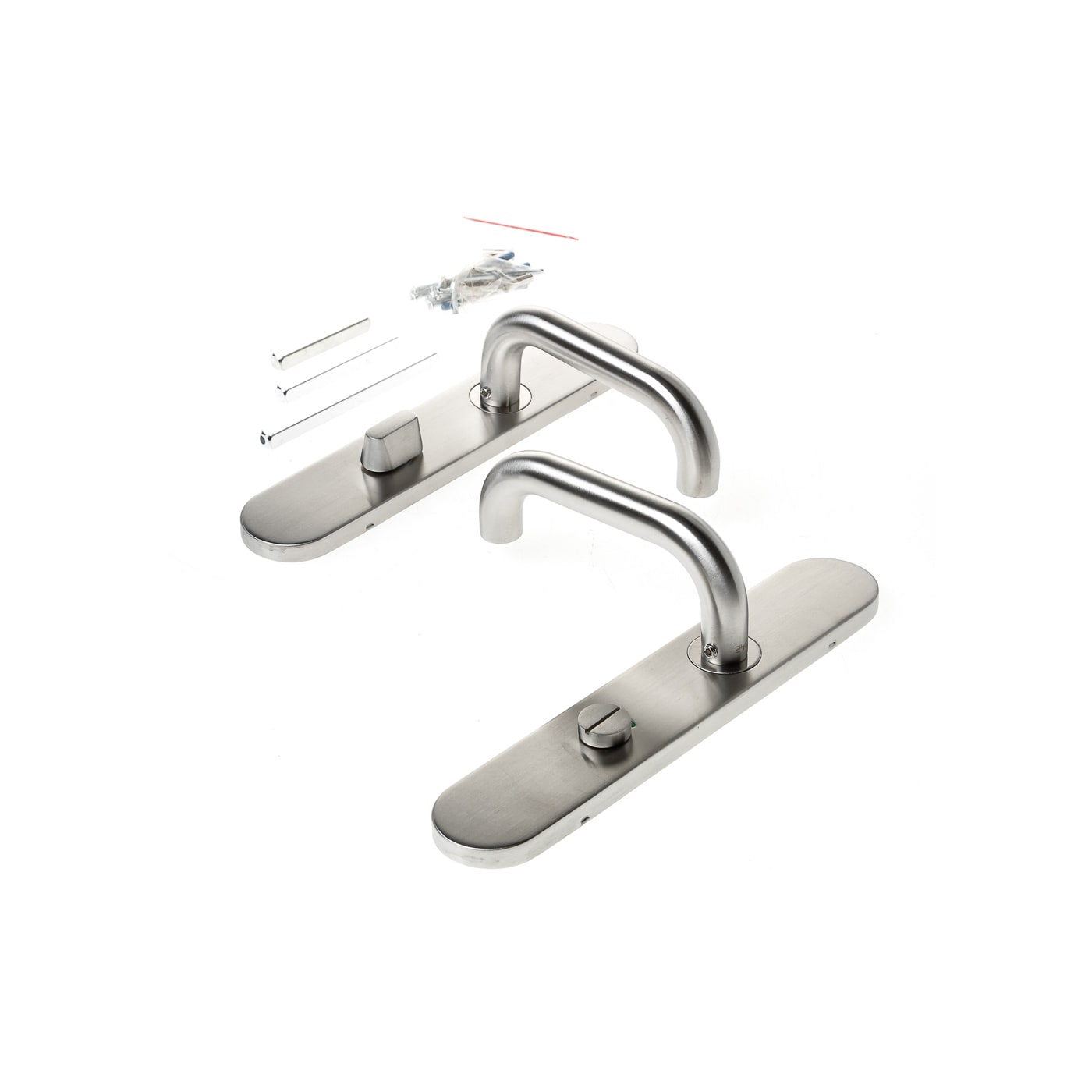 Deurkrukgarnituur, D-model deurkruk, op schilden, roestvaststaal, WC 8x72, din links, geschikt voor deurdikte 37-56mm
