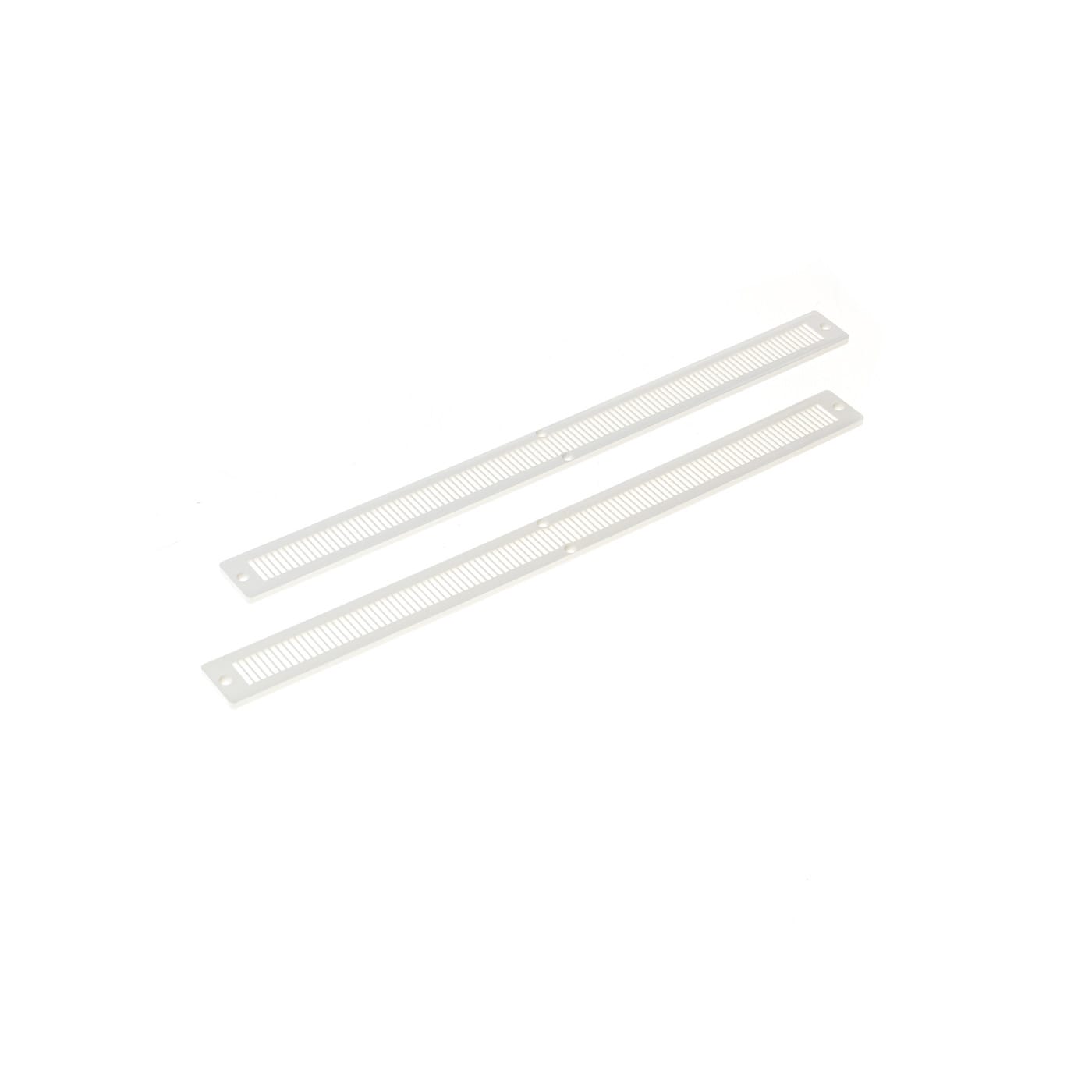 Kunststof vlak doorstroomrooster niet afsluitbaar, opbouw.De roosterset bestaat uit 2 dezelfde roosters, 1 voor binnen en 1 voor buiten.Maat rooster: 363L x 29H x 4B mmTe frezen sleuf: 330L x 16H mmTe boren gaten: 16 stuks ø 16mmDoorlaat: 32 cm²dm³/s 1Pa: 3,6