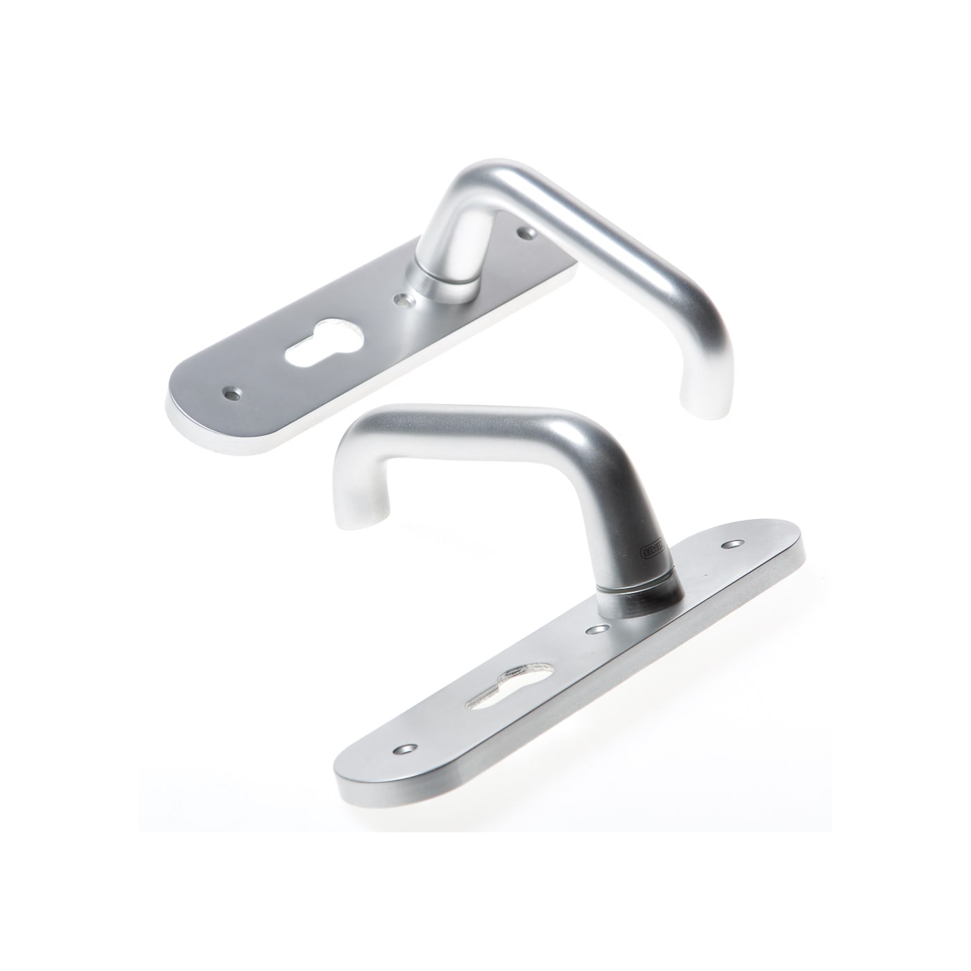Aluminium geanodiseerd, zilverkleur F1, voor binnendeuren. D-model kruk 3253 lengte 120 mm, vastdraaibaar en verend gemonteerd op langschild van 198,5x43,5x9 mm.