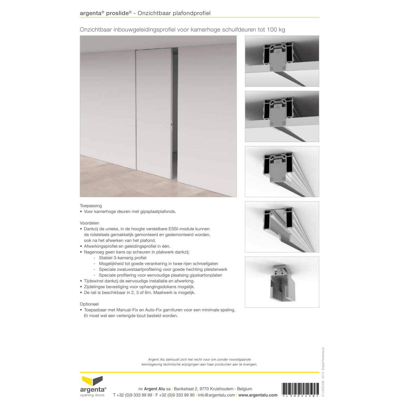 Om een minimale speling tussen de deur en het plafond te garanderen, wordt het Proslide invisible plafondprofiel steeds gecombineerd met het Proslide manual-fix of het Proslide auto-fix bevestigingssysteem. Hierbij worden de beugels in de deur in gefreesd waardoor er slechts een geringe speling van 4mm nodig is tussen de deur en het plafond.