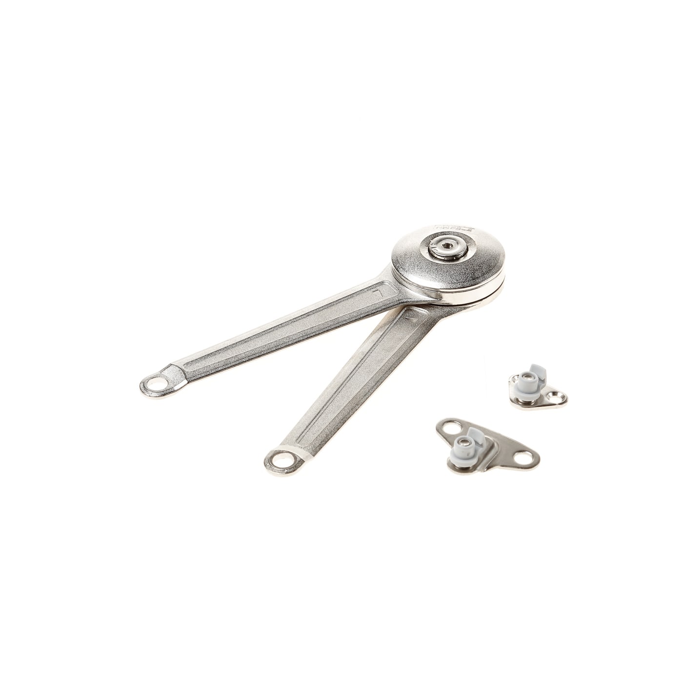 Klepsteun/klepschaar, Duo Forte Complete Set voor aluminum zijafstand: 28 mm, vernikkeld, voor plaatschroeven Materiaal zink-aluminium legering Oppervlak Vernikkeld Aanslag links en rechts te gebruiken Montage voor plaatschroeven Instelmogelijkheid vastzetvermogen Levering bestaat uit 1 klepsteun 1 bevestigingshoek voor corpus 1 schroefplaatje voor klep