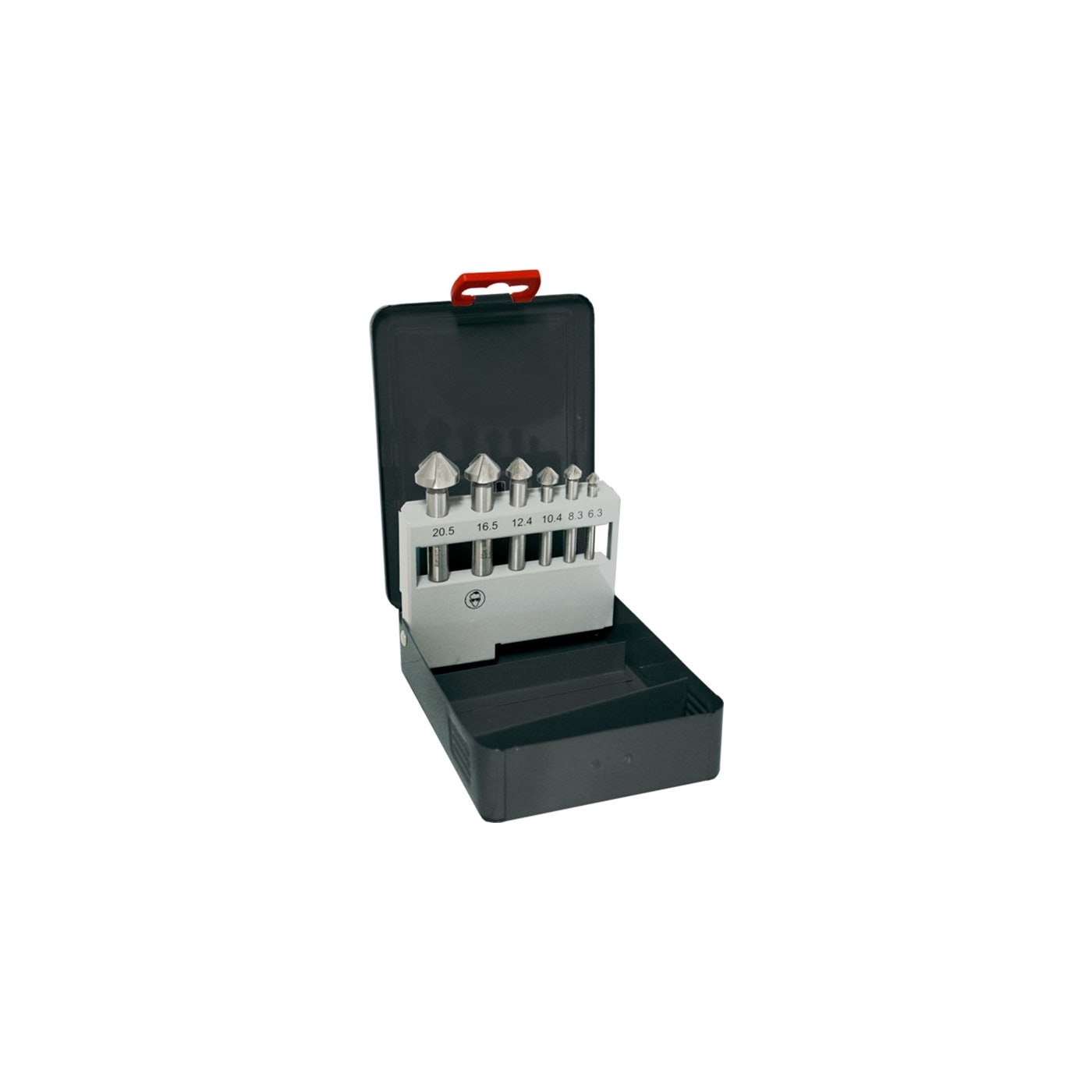 Type HSS. 6-delige set, in metalen cassette. Met hoge standtijd, speciaal geslepen voor het ontbramen en braamvrij verzinken. Geschikt voor verzinkwerk in staal, gietijzer, gelegeerde - en non-ferro metalen, kunststof en hout.freesdiam. mm    schachtdiam. mm  6,3                         5  8,3                         610,4                         612,4                         816,5                       1020,5                       10