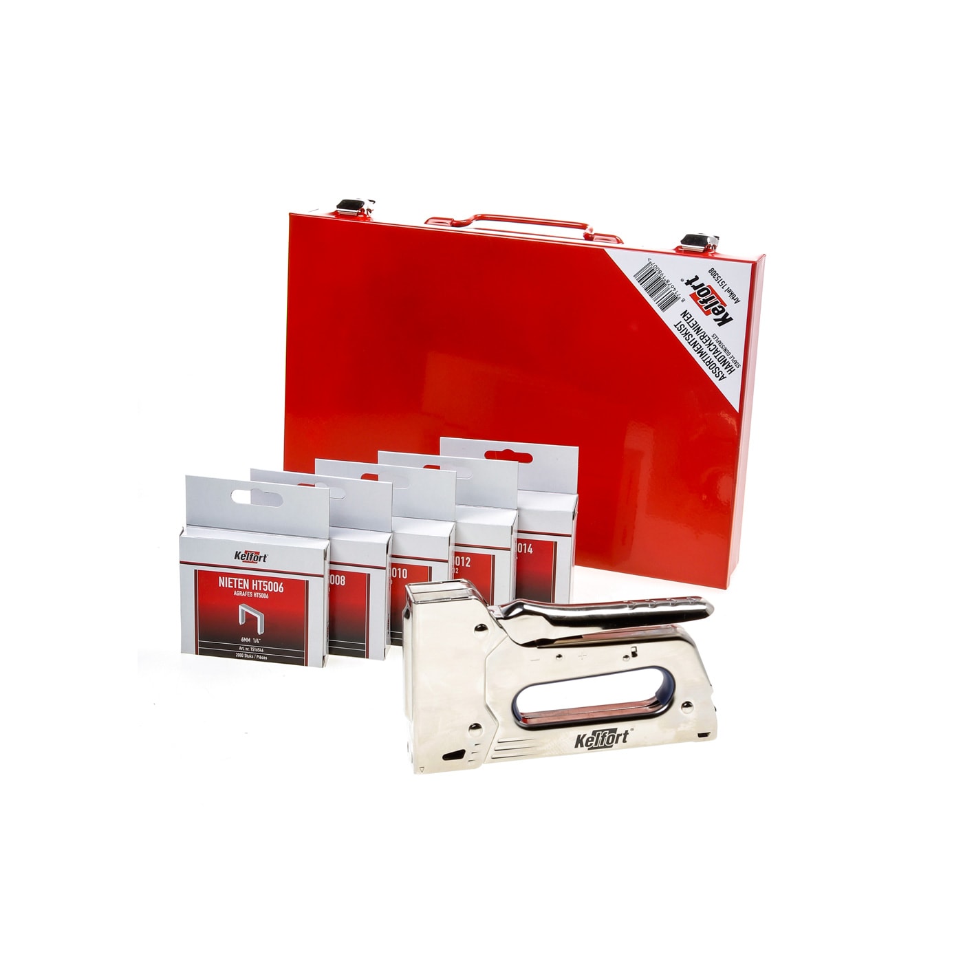 Metalen rood gelakte kist met twee sluitingen en metalen vakindeling.Inhoud:Nietenartikel nr___type_____ lengte in mm___breedte in mm___stuks1516546___HT5006____6____________1/4"___________2.0001516547___HT5008____8____________5/16"__________2.0001516548___HT5010___10____________3/8"___________2.0001516549___HT5012___12____________1/2"___________2.0001516550___HT5014___14____________9/16"__________2.000Inclusief HT50 handtacker Heavy Duty (1516532)