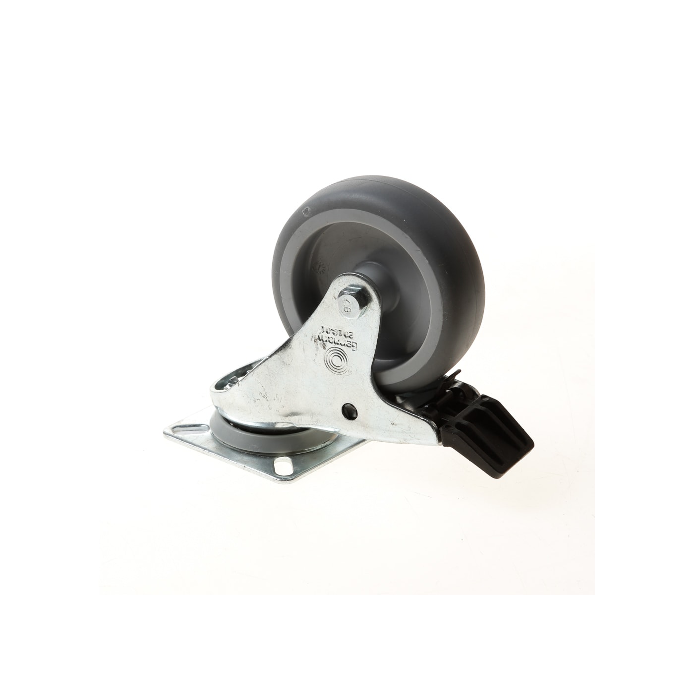 Elektrolytisch verzinkt met plaat en rem. Blauw/grijs rubber wiel met glijlager.