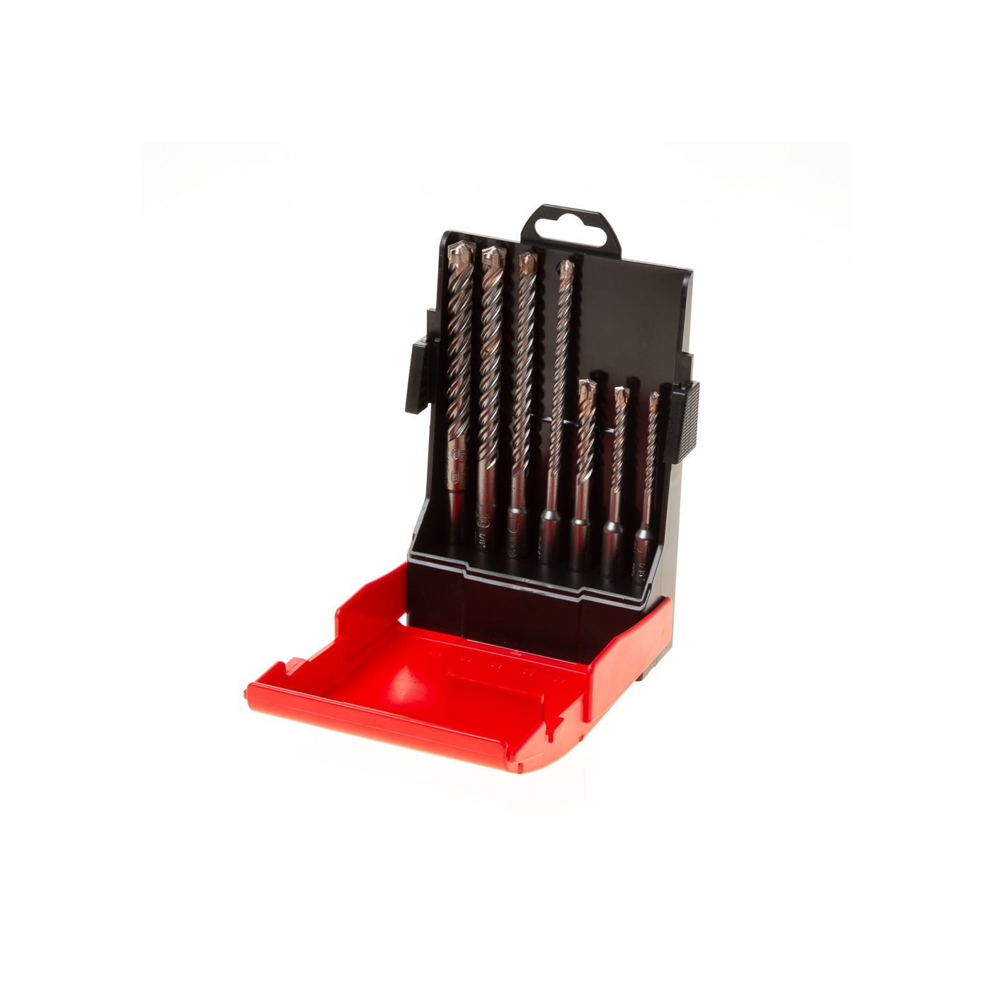 7-delig. Type 4-snijder. Zeer robuust met 4 snijvlakken voor hoge levensduur met ingelaten hardmetalen kop voor extreme duurzaamheid in wapening en krachtige boorprogressie. Geoptimaliseerd kop- en spriaaldesign voor zeer effectief boormeeltransport en minimale stofverstuiving ook in diepe boorgaten. In kunststof cassette.