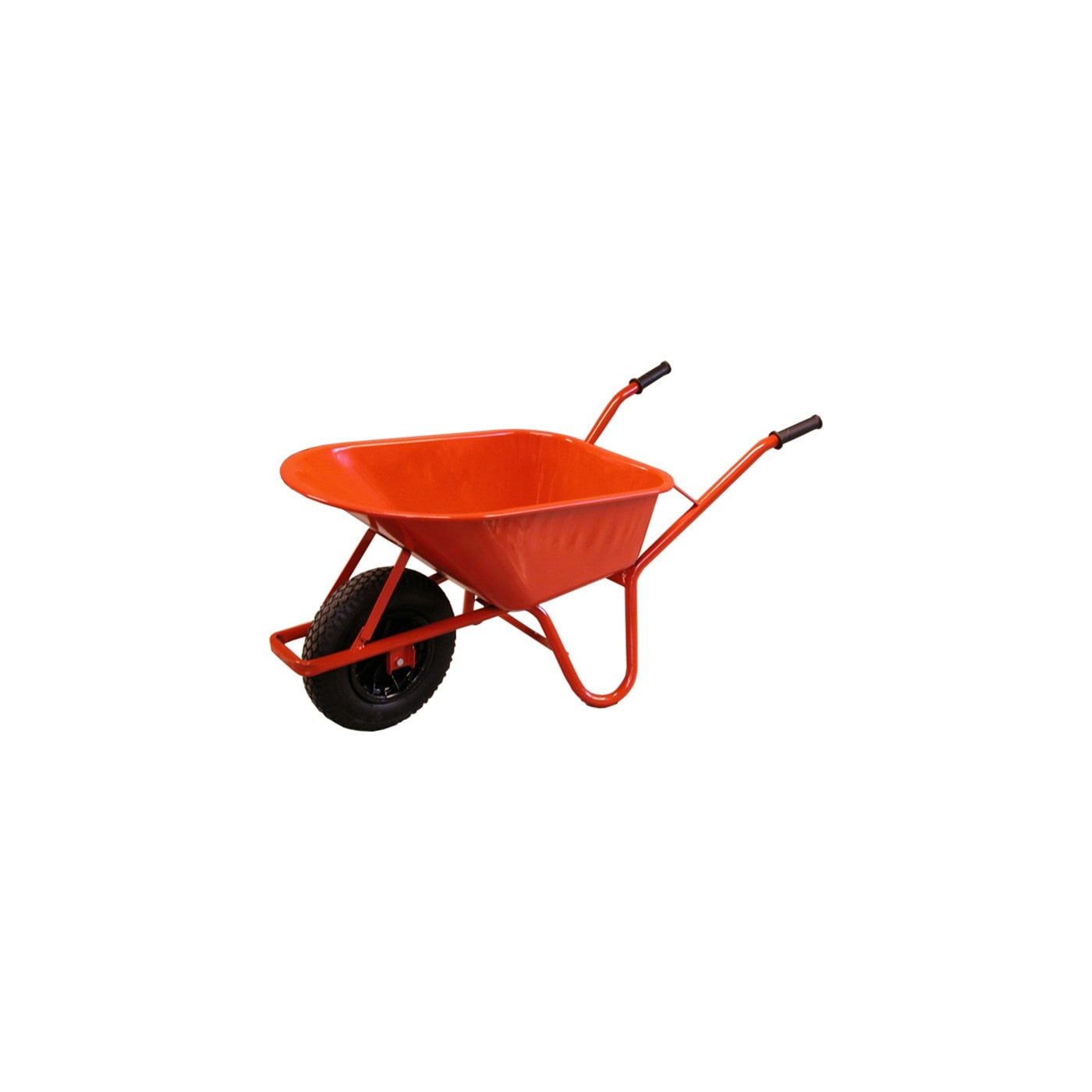 Model Biga. Uit één stuk geperste 1,2 mm dikke bak, rond buisframe, diameter 30x1,5 mm op kogelgelagerde kunststof wiel, afmeting 400x80 mm. Gelast en gemonteerd onderstel, bak met kip- en steunbeugel, verstevigingsbrug, extra brede draagbrug en slijtsloffen aan de poten. Met 4-ply luchtband, met binnenband. Inhoud 85 liter.