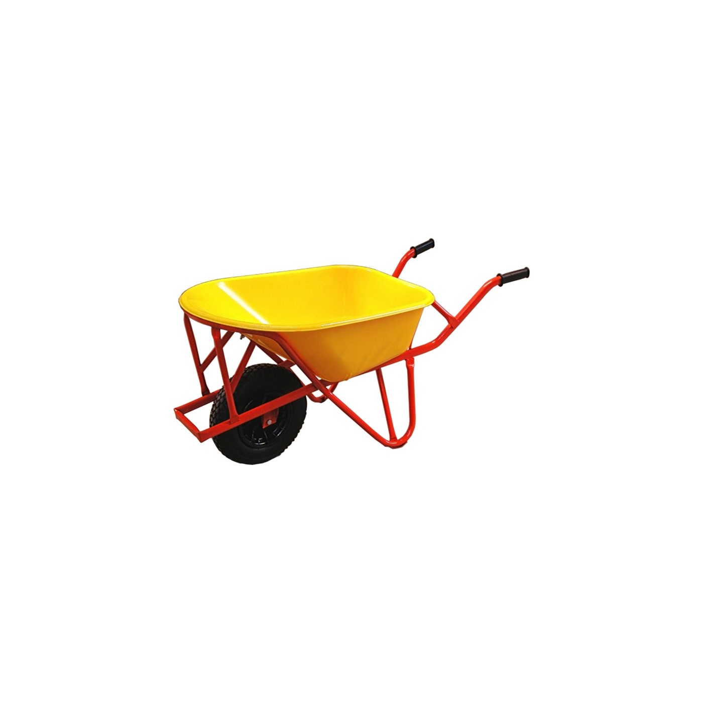 Uit HDPE en verstevigde bak, ovaal buisframe, diameter 30x1,5 mm op kogelgelagerd kunststof velg, afmeting wiel 400x80 mm, 4-ply luchtband, met binnenband. Gelast en gemonteerd onderstel met kip- en steunbeugel, extra sterke verstevigingsbruggen en slijtsloffen aan de poten. Inhoud 85 liter.