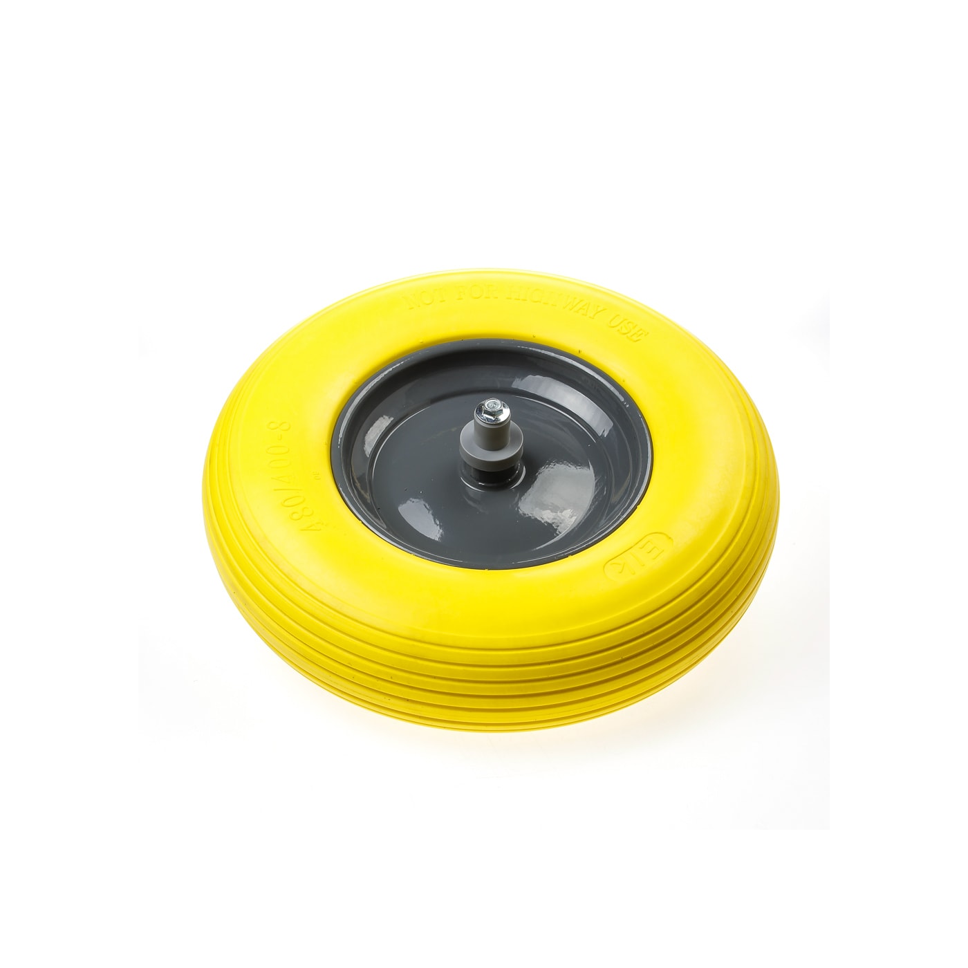Compleet wiel met kogelgelagerde as met een diam. van 130 mm en stalen velg met 400x80 mm massief gele polyurethaan band. Voor jarenlang zorgeloos rijden zonder lekke banden met de eigenschappen van een luchtband.