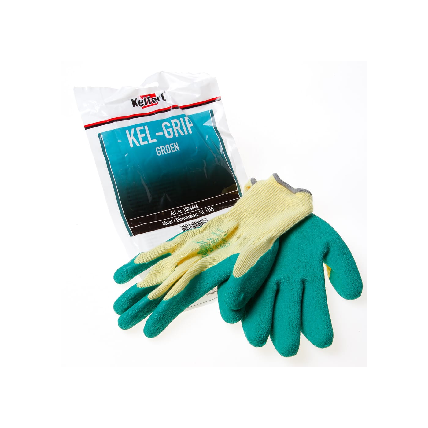 Model KEL-GRIP GROEN. Naadloze polyester/katoen handschoen met latex coating op de palmen. Open rug en vingers voor ventilatie. Geeft bescherming tegen vloeistoffen en mechanische factoren bij de handpalmen. Geschikt voor gebruik in de bouw, industrie, transport, constructie, bagageverwerking, gemeentelijke en openbare diensten. Gekeurd volgens CE categorie II.
