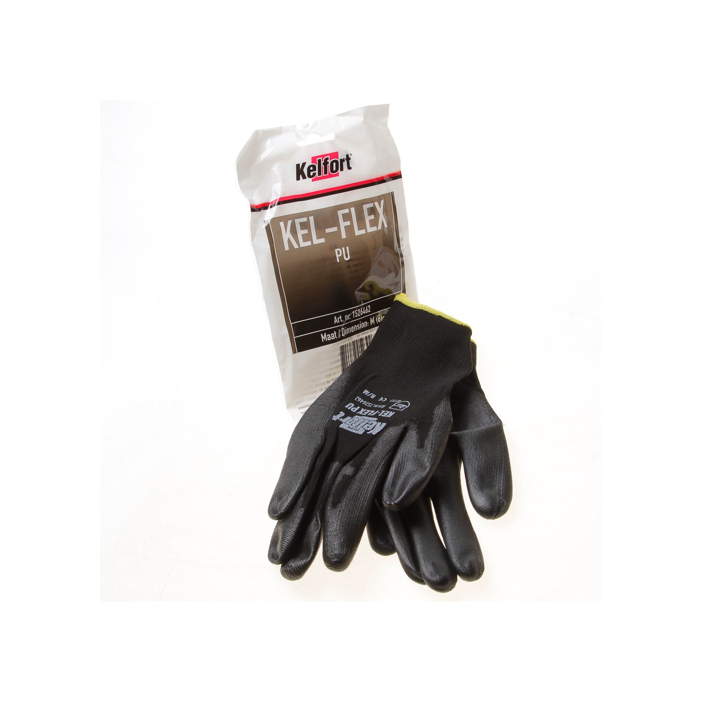 Model KEL-FLEX PU. Zwart/witte nylon handschoen met PU coating op de palmen. Open rug en vingers voor ventilatie. Met tricot manchet. Deze werkhandschoenen beschikken over een zeer goede vingergevoeligheid en zijn ideaal voor de assemblage van kleine onderdelen (zoals schroefjes en veertjes), maar ook voor gebruik in de bouw, constructie, assemblage, logistiek, transport en installatietechniek. De witte variant wordt tevens veel gebruikt in de afbouw, bijvoorbeeld door schilders en stukadoors.