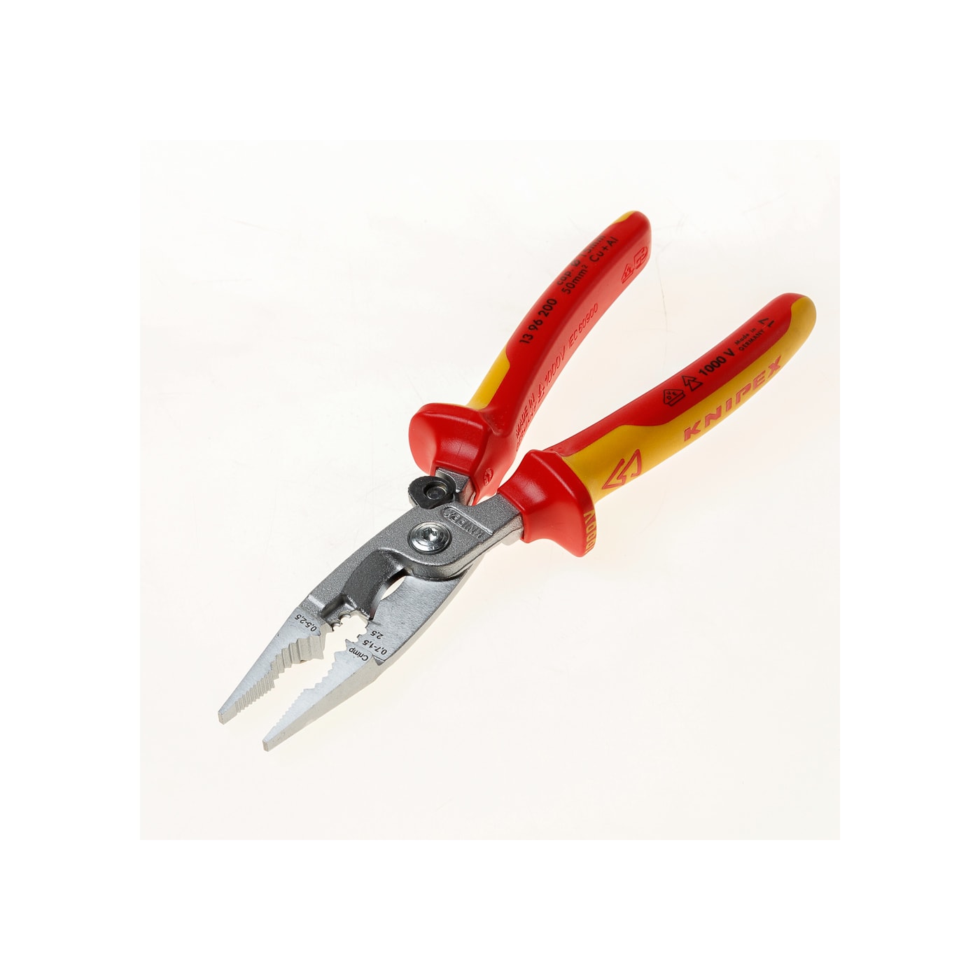 6 functies in één tang. Multifunctionele tang voor de elektrische installatie- om vlakke en ronde materialen te grijpen, buigen, ontbramen, kabelsnijden, afstrippen en krimpen van adereindhulzen. Gladde grijpvlakken aan de punt voor een beschadigingsvrij grijpen van draden- geprofileerde grijpvlakken en brandergat om vlak en rond materiaal te grijpen. Markante buitenkant aan de klauw om verborgen dozen te bewerken en om doorvoergaten te ontbramen. Afstrip-uitsparingen voor kabels 0,75 tot 1,5 mm² en 2,5 mm². Krimp positie voor adereindhulzen 0,5 - 2,5 mm². Kabelschaar met precisie-snijkanten (inductief gehard) voor Cu- en Al-kabel tot 5 x 2,5 mm² / Ø 15 mm. Grijpen zonder de tang volledig te openen (intelligent dichthoudmechanisme bij de versie met openingsveer). De snijkant blijft gesloten en beschermd. Slanke constructie voor goede toegankelijkheid. Precies, soepel lopend geschroefd scharnier Model: Bij de modellen met in het scharnier geïntegreerde openingsveer houdt de geactiveerde vergrendelingsklink de lemmeten gesloten terwijl de andere functies behouden blijven. Met het intelligente dichthoudmechanisme kan men "grijpen" zonder de tang te openen. Het lemmet blijft gesloten en beschermd..