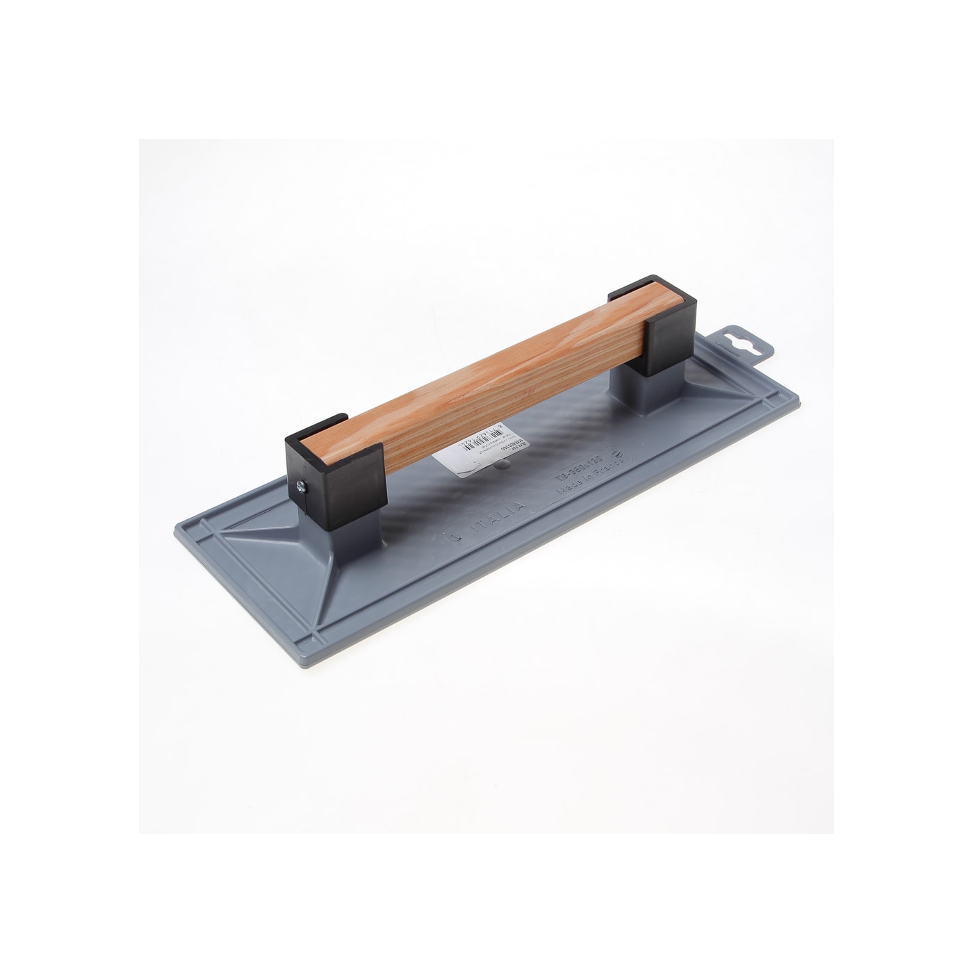 Met rechthoekig geprofileerd kunststof blad en ingesloten verhoogd houten handvat.