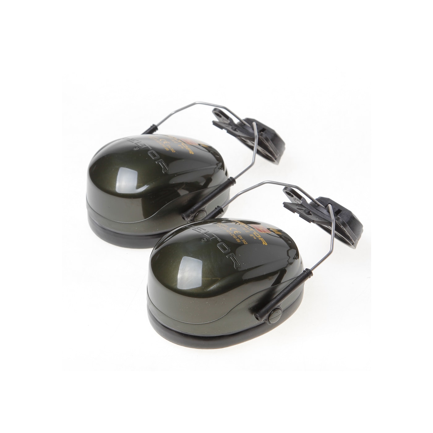 Groene oorkappen voor bevestiging op helm vervaardigd uit combinatie van kunststof en roestvrij staal.