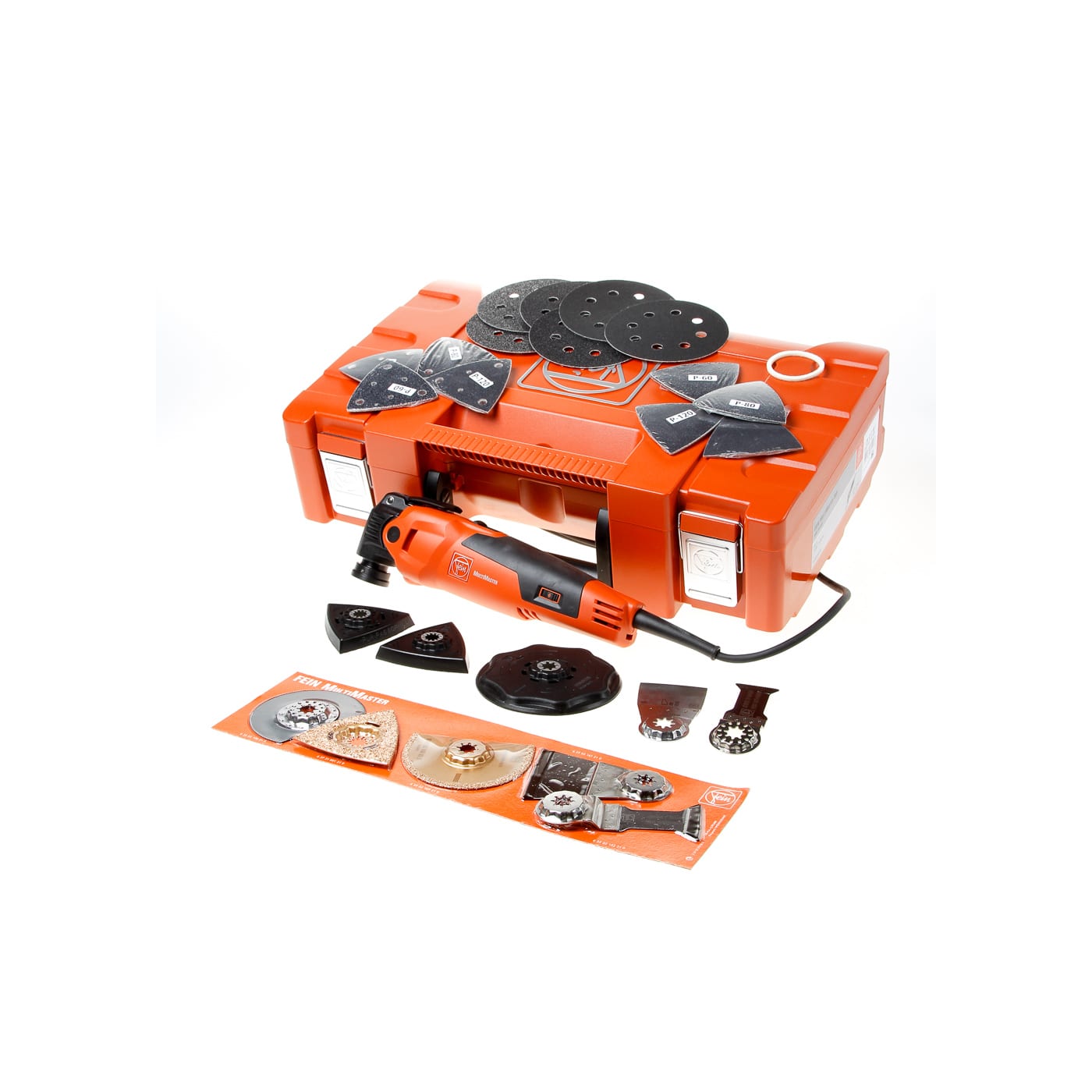 Bestaande uit kunststof systeemkoffer met: FEIN MultiMaster met Starlock-snelspansysteem-steunplateau inclusief schuurpapier 3xK60, 80, 120, 180- voor stofafzuiging: steunplateau met gaten inclusief geperforreerd schuurpapier 3xK60,80,120,180 en afzuighulpstuk - starre spatel- HSS segmentzaagblad 65mm- zaagblad E-CUT universal 44 mm- zaagblad E-CUT long-life 65mm- zaafblad E-CUT long-life 35mm- hardmetalen segmentzaagblad- hardmetalen rasp - rond 115mm steunplateau, geperforeerd inclusief geperforeerd schuurpapier 2x K60,80,180