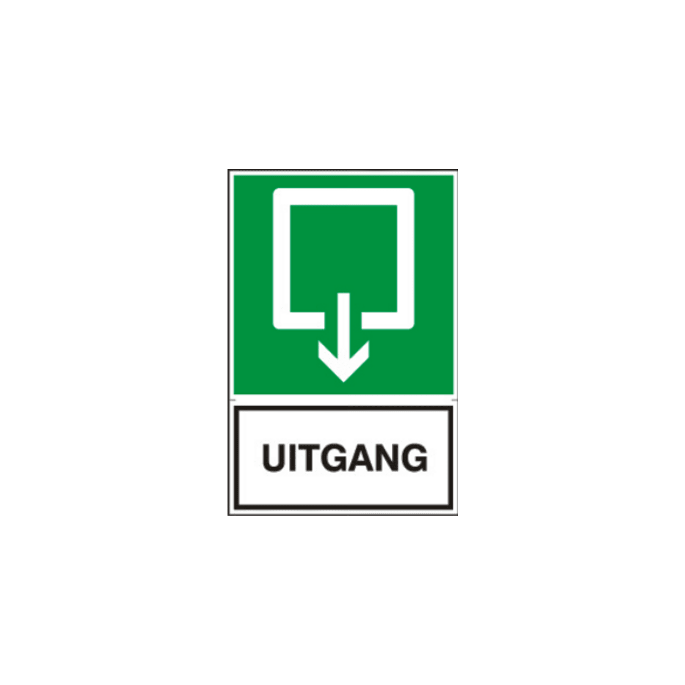 Uitgang, vervaardigd uit hard pvc (0,7 mm), voorzien van een zeer krachtige acryl kleeflaag en bedrukt met UV-bestendige inkt, waardoor ze bij gebruik buiten niet verkleuren. Volgens de Europese richtlijn 92/58/EEG.