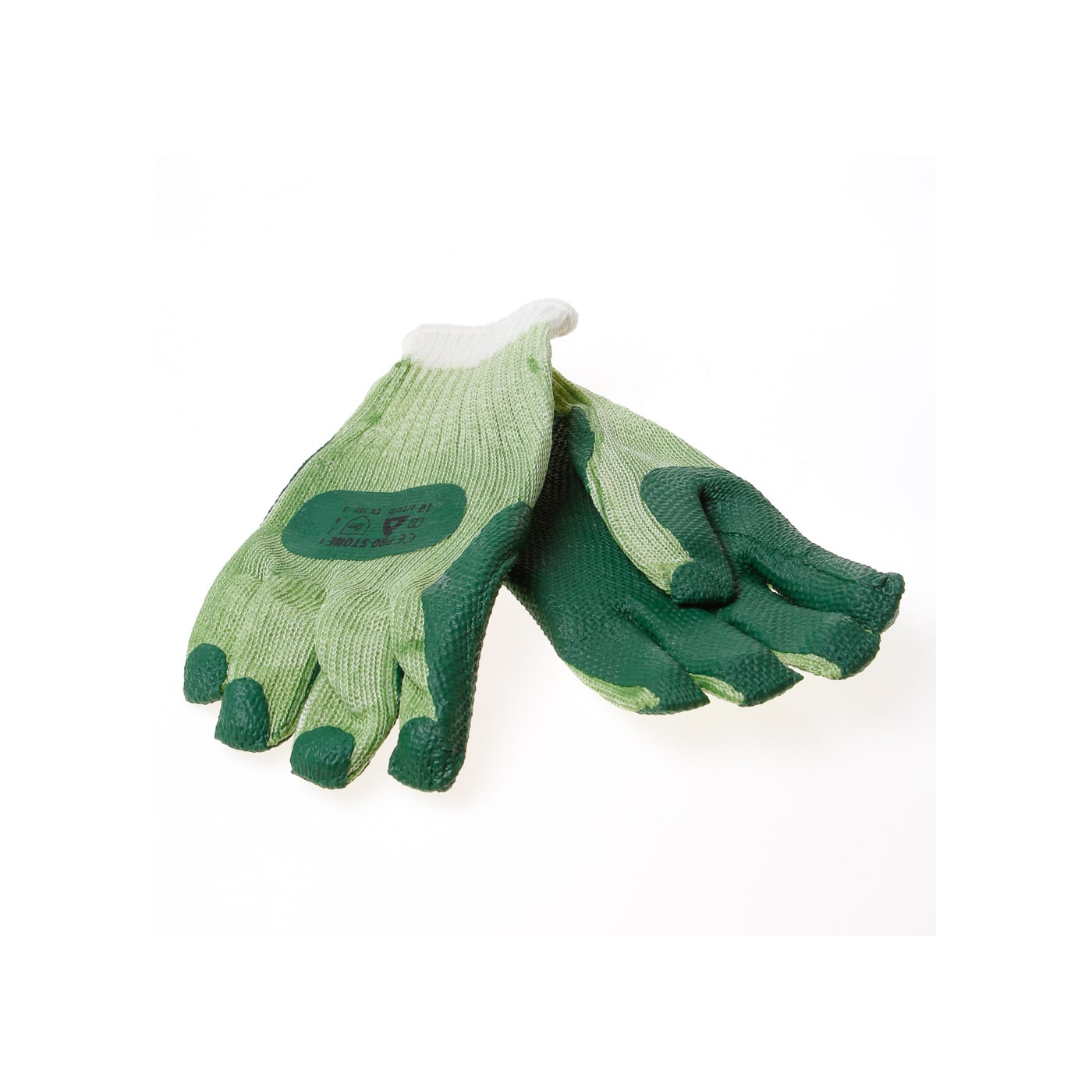 Handschoen in katoenbreiwerk met groene latex coating.Tricot boord.Zeer goede schuur- en snijbestendigheid, uitstekende grip.Vingertop-, slagader- en kneukelbescherming.Geschikt voor: bouw, bij stratenmakers, logistiek en in de glasindustrie.Maten: 10.Conform: EN 388 4.2.4.3.