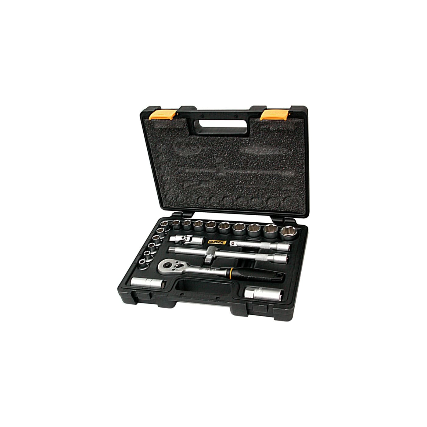 22-delig, in sterke kunststof koffer. Met 1/2" aansluiting.Bestaande uit:· 1 ratel quick release 45-tands.· 1 cardanscharnier.· 1 adapter 3-weg: 3/8"x1/2".· 2 verlengstukken: 50 mm en 125 mm.· 2 bougiedoppen: 16 mm en 21 mm.· 15 doppen: 8, 9, 10, 11, 12, 13, 14, 15, 17, 19, 20, 21, 22, 24 en 27 mm.