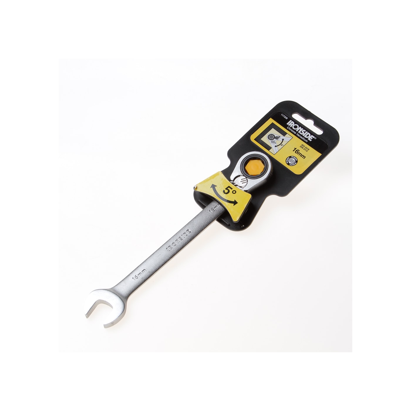 Chroom-vanadiumstaal met omstelbare ringratel, actiehoek 5°, steeksleutel 15° gebogen.