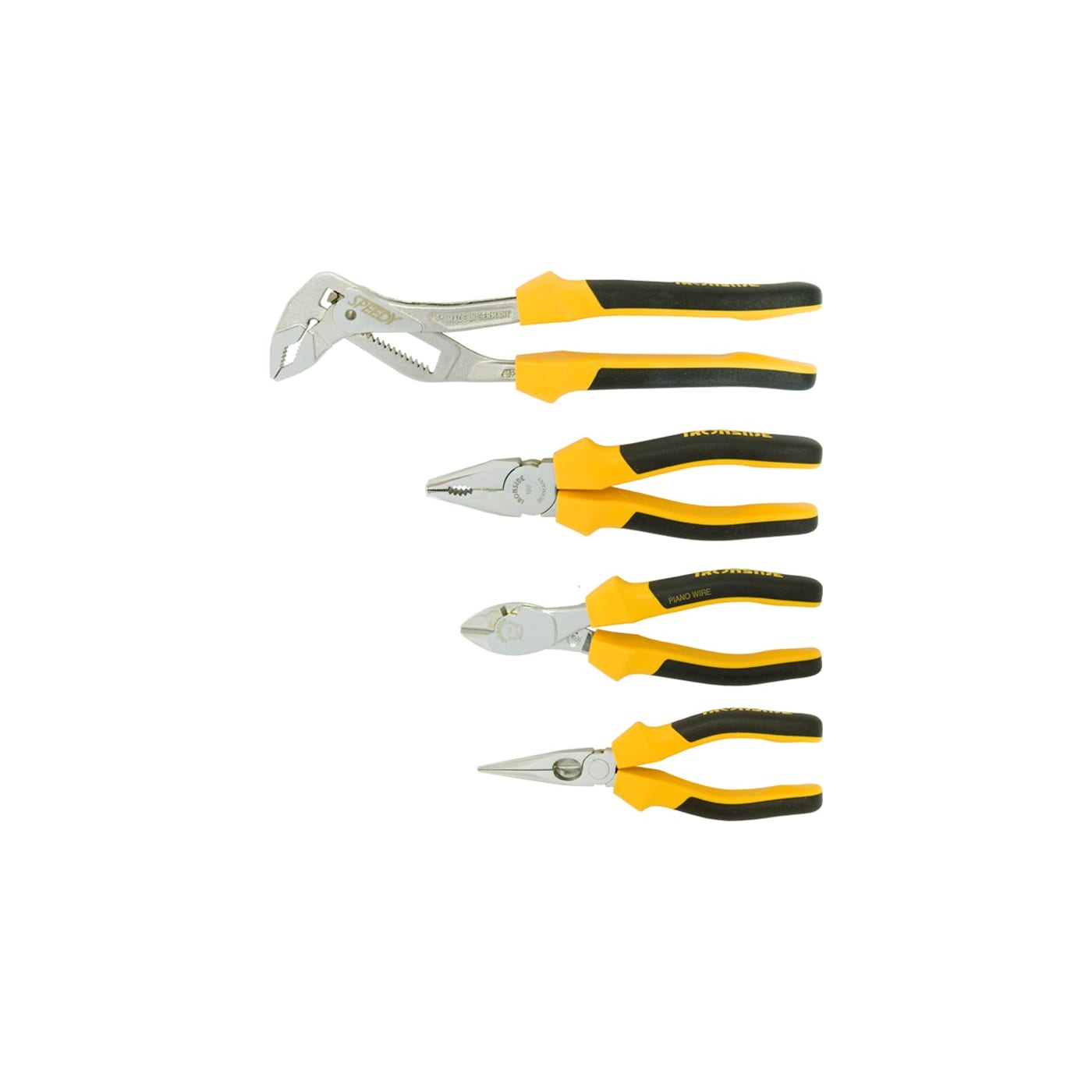 4-delige set, bestaande uit: waterpomptang Speedy 250 mm, met doorgestoken scharnier, combinatietang 180 mm, zijsnijtang 160 mm en telefoontang, recht model 160 mm. De tangen zijn verchroomd en voorzien van zware twee-componenten handvatten.