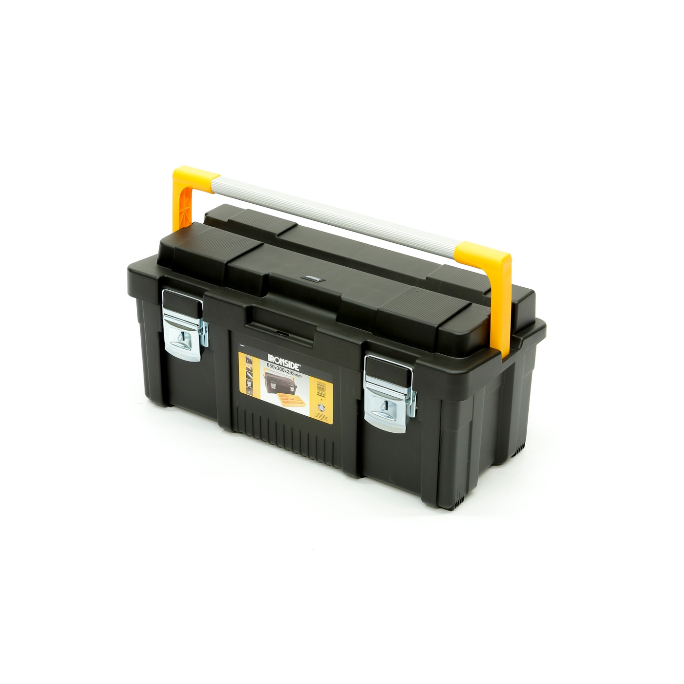 Gereedschapskoffer van polypropyleen met uitneembare draagbak, aluminium handgreep en metalen sluitingen. Voorzien van V-groef in de deksel voor het zagen van buizen of hout.