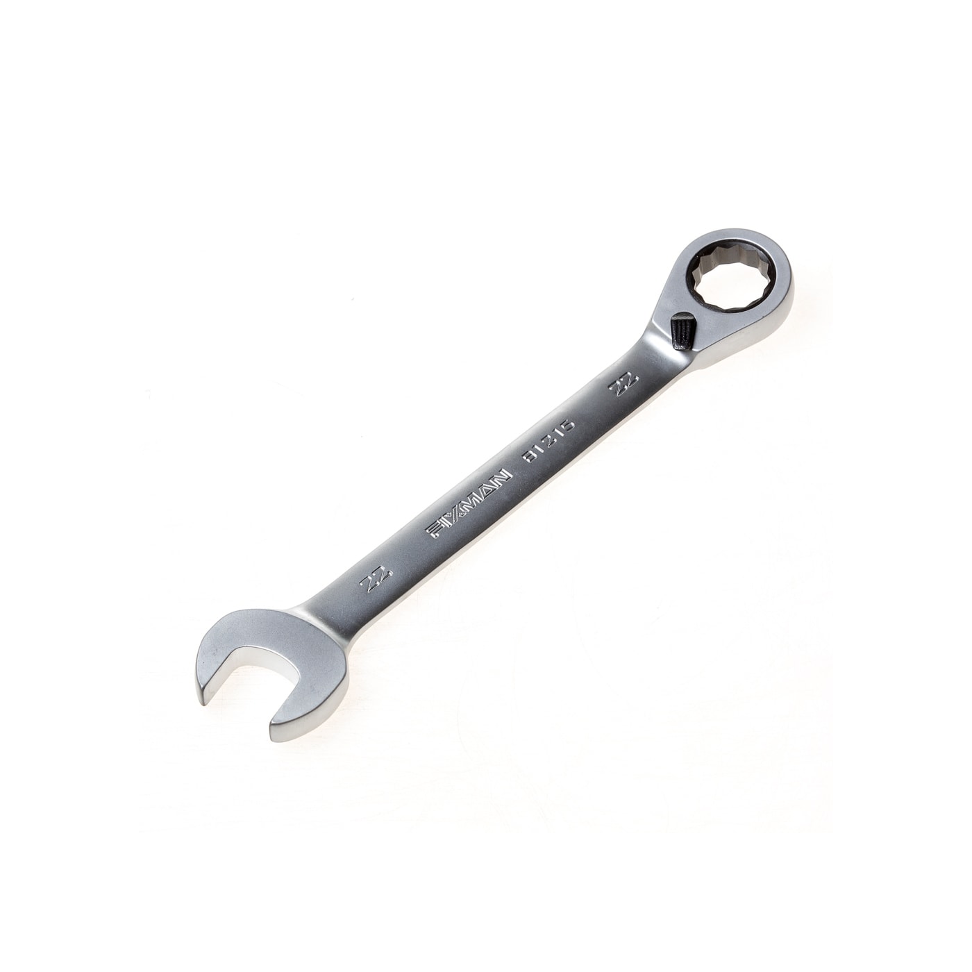 Ring- en steeksleutel met omstelbare ratelfunctie. Bek- en ringmaat 22mm.