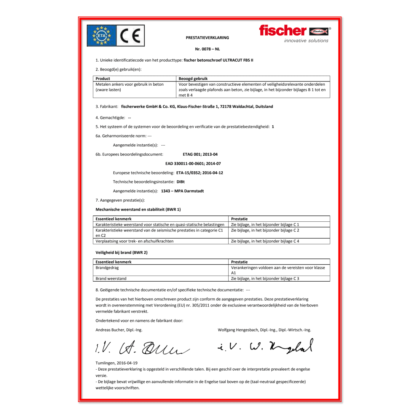 De fischer FBS II is de betonschroef voor optimaal montagecomfort. De speciale tandgeometrie maakt het snel indraaien in beton mogelijk. Bij montage in plafond of vloer hoeft het boorgat niet schoonmaakt te worden. Dankzij de nationale goedkeuring is een meervoudige gebruik bij tijdelijke verankeringen, bijv. bij bekistingswerkzaamheden geen probleem. Voor de montage van de muurbout wordt een tangentiële slagschroefmachine met een voor de slagschroevendraaier geschikte bit of een speciale TX-bit aanbevolen. De betonschroef kan bijvoorbeeld uitstekend voor het bevestigen van leuningen, botsbeveiligingen, consoles of bekistingen worden gebruikt.