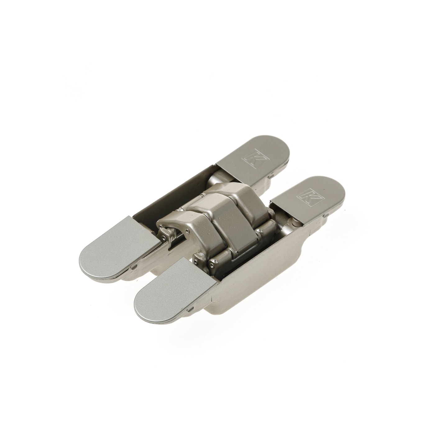 Een verborgen scharnier van zeer bestendig staal voor verzonken deuren met houten, stalen en aluminium kozijnen. Draagvermogen tot 80 kg, 180 ° openingshoek met een minimale deurdikte van 40 mm. Slijtvaste bussen, smering / onderhoud niet nodig, omkeerbaar voor rechts- en linkse deuren RH / LH.3D-verstelbaar, alle aanpassingen zijn onafhankelijk, gereedschapsgestuurd en zelfladend. Aanpassingen: horizontaal + 3,0 / -2,0 mm, verticaal +/- 3,0 mm, diepte +/- 1,0 mm.